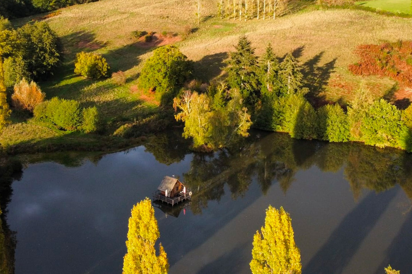 La cabane du paraclet fut la première cabane construite. Elle profite du plus grand de nos étangs. Elle accueille les pêcheurs et les amoureux des tours de barque!